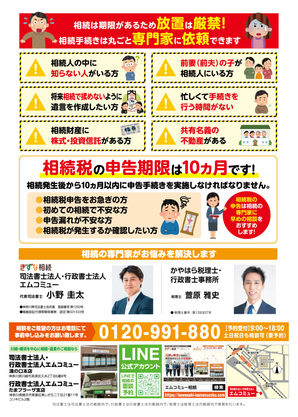 川崎市で相続や遺言、生前贈与でお悩みをお持ちの方は、この機会にお気軽にお問い合わせください。