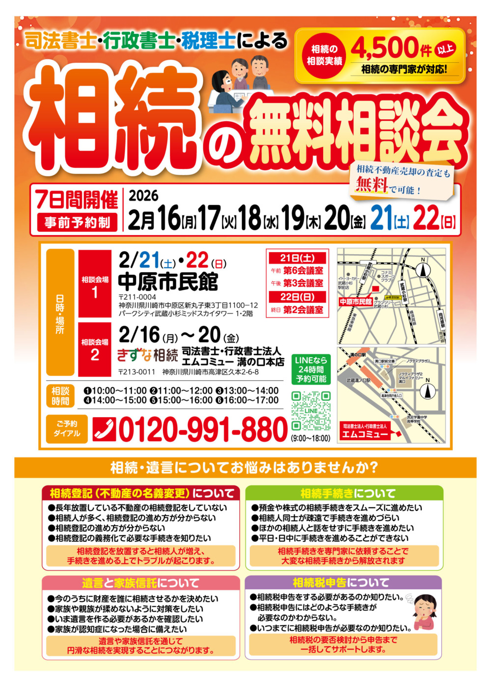 川崎市で相続や遺言、生前贈与でお悩みをお持ちの方は、この機会にお気軽にお問い合わせください。